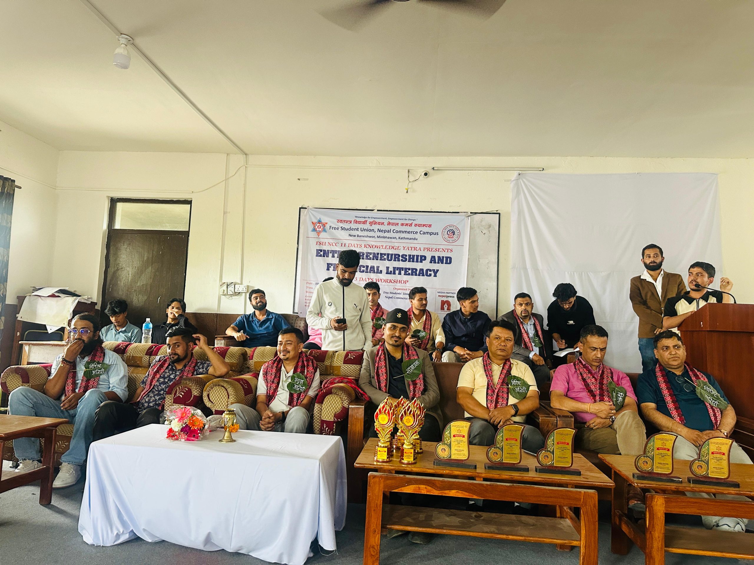 स्वतन्त्र विद्यार्थी युनियन, नेपाल कमर्स क्याम्पस द्वारा आयोजित FSUNCC 11 Days Knowledge Yatra – 2082 अन्तर्गत Entrepreneurship and Financial Literacy 3 Days Workshop आज सम्पन्न भएको छ। समापन कार्यक्रम क्याम्पसको BBA हलमा सम्पन्न भएको हो।
